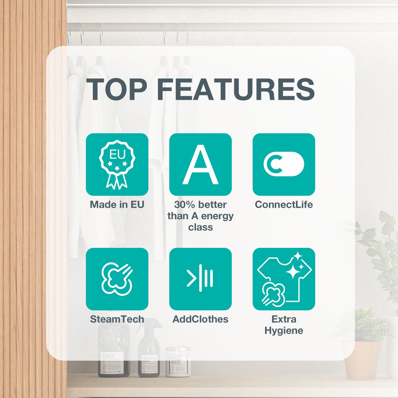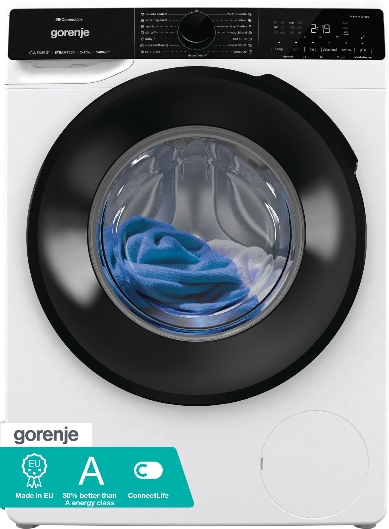 - Osnovni programi: Bombaž, Mix sintetika, Volna/ročno pranje, ExtraHygiene